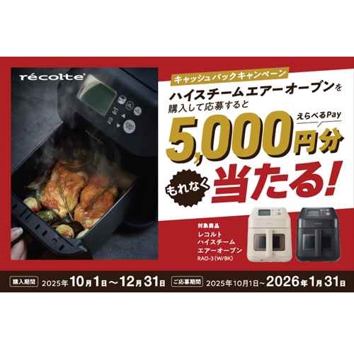 「レコルト ハイスチームエアーオーブン」を購入して応募すると、もれなく5,000円分のえらべるPayが当たります。